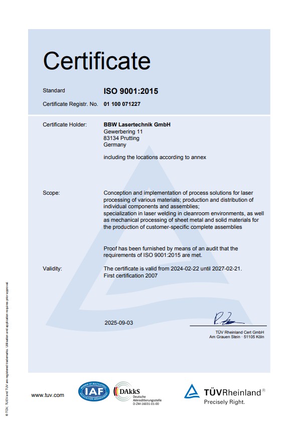 We at BBW Lasertechnik are committed to the highest quality standards. Our ISO 9001:2015 certification is proof of our commitment to providing you with reliable, high-quality services in the field of laser material processing.