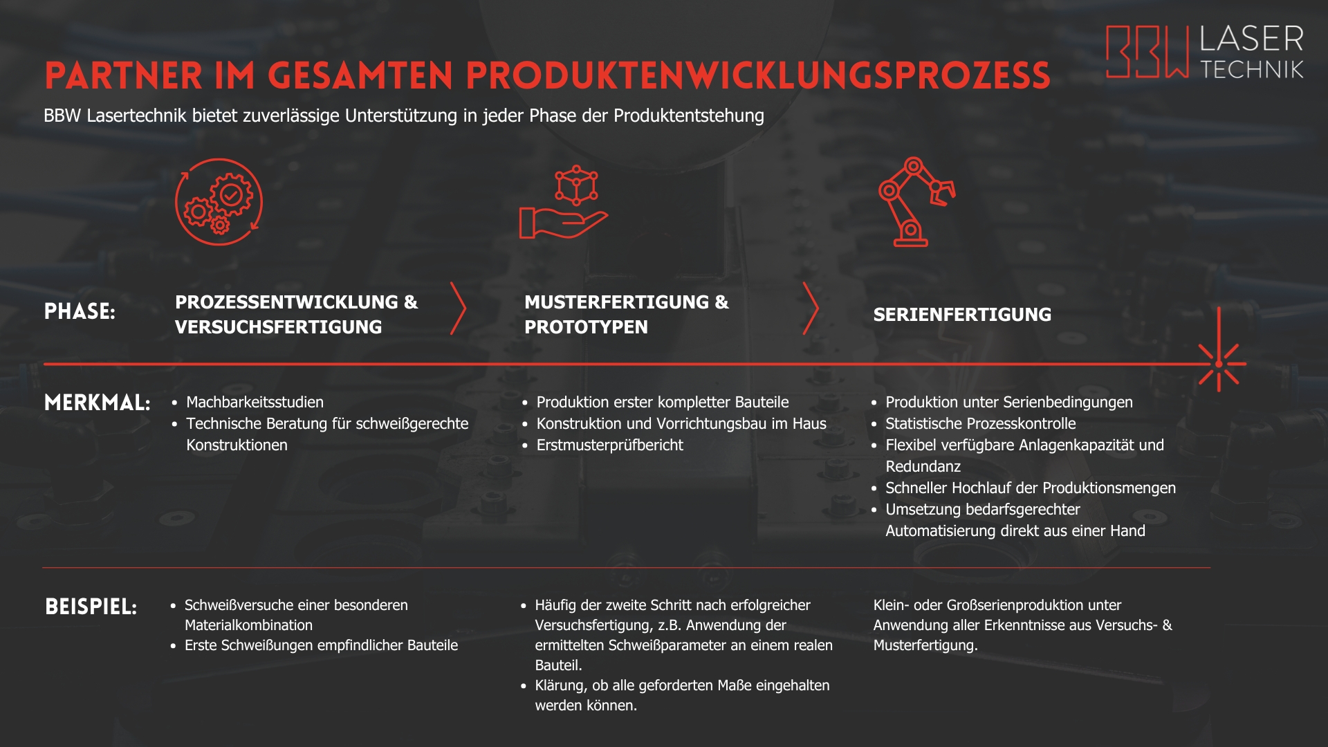 Durch unsere breite Auswahl an Strahlquellen und Systemtechniken, einem eigenen Maschinenbau sowie einem hohen Automatisierungsgrad sind wir in der Lage, schnell und flexibel auf die Anfragen unserer Kunden zu reagieren und modulare Produktionslinien bei BBW Lasertechnik aufzubauen. Folglich übernehmen wir als Subunternehmer für das Laserschweißen bearbeiteter Teile neben der Einzelteilfertigung auch kleine, mittlere und große Serien für unsere Kunden – dauerhaft oder vorübergehend. Durch diese hohe Flexibilität und unseren umfangreichen Maschinenpark sind wir in der Lage, bei Herausforderungen auch kurzfristig Produktionskapazitäten bereitzustellen.